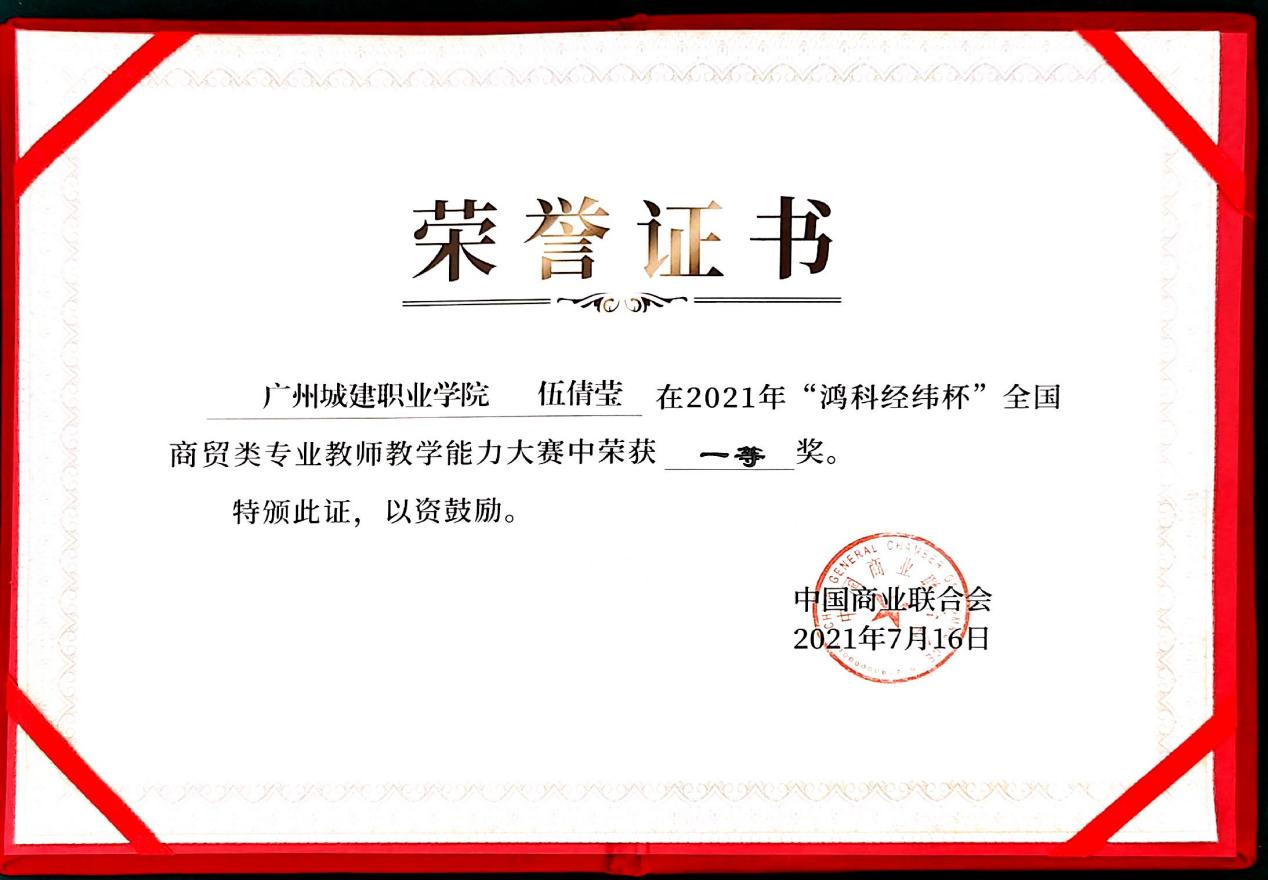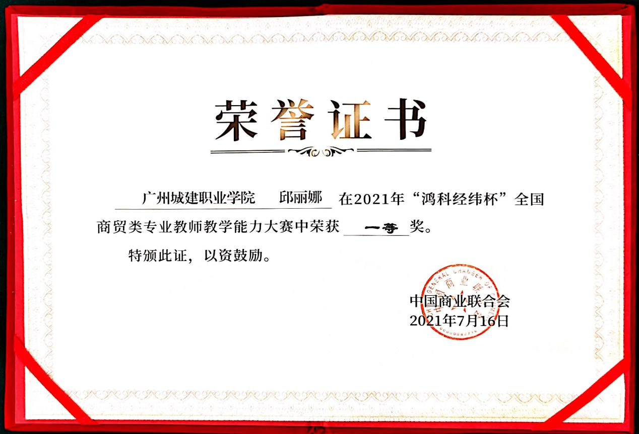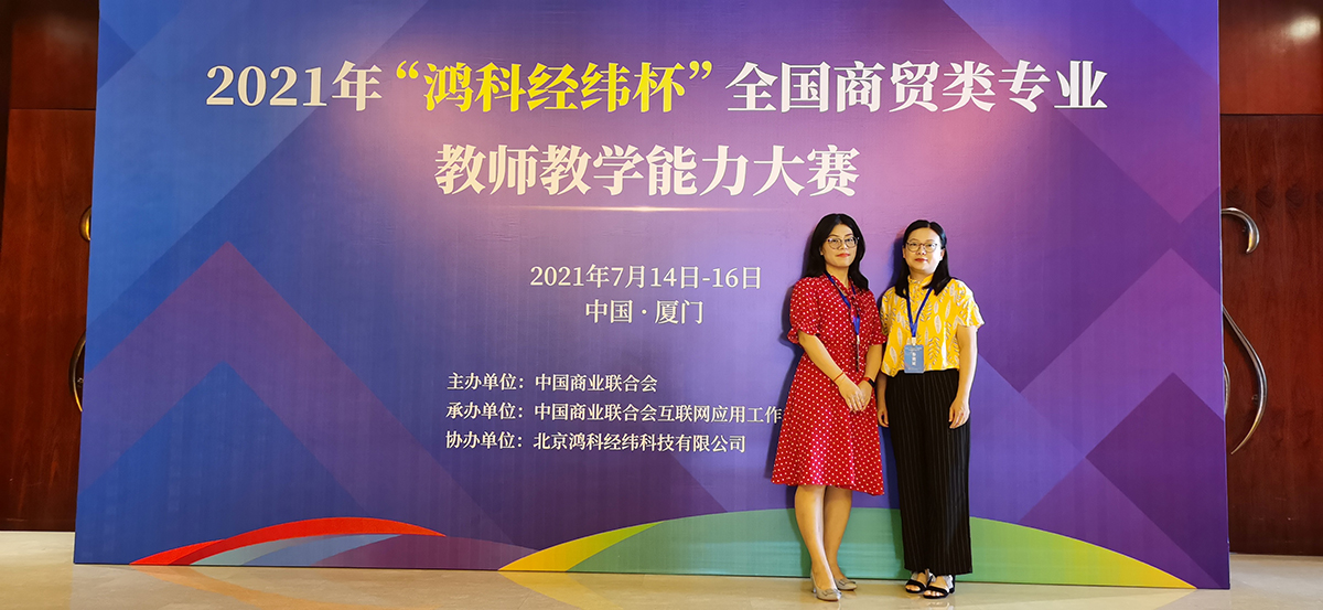 7月14-16日,由中国商业联合会主办、中国商业联合会互联网应用工作委员会承办、北京鸿科经纬科技有限公司协办的2021年“鸿科经纬杯”全国商贸类专业教师教学能力大赛在厦门杏林湾大酒店(中华全国总工会厦门劳动模范疗修养中心)顺利落下帷幕。经过现场比拼,公司电子商务教研室副主任邱丽娜、专任教师伍倩莹均荣获一等奖,各获得3000元奖金。