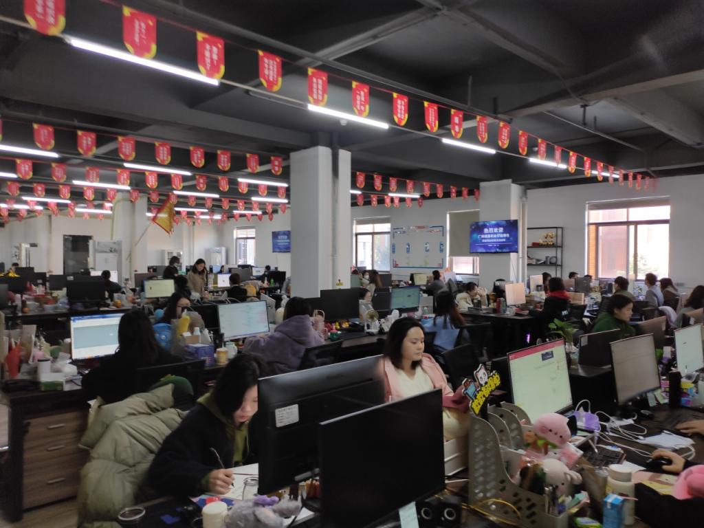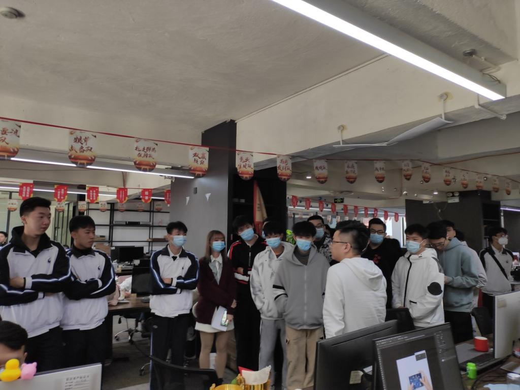 同学们在公司的统一安排下,乘坐校车来到公司,在公司招聘总监黄辉雄等人的带领下,同学们参观了公司的客服部、运营部、设计部、直播间、食堂、健身房等,并且现场观看各个业务部门的工作情况,由工作人员演示具体的工作流程,提前了解公司各岗位工作业务。