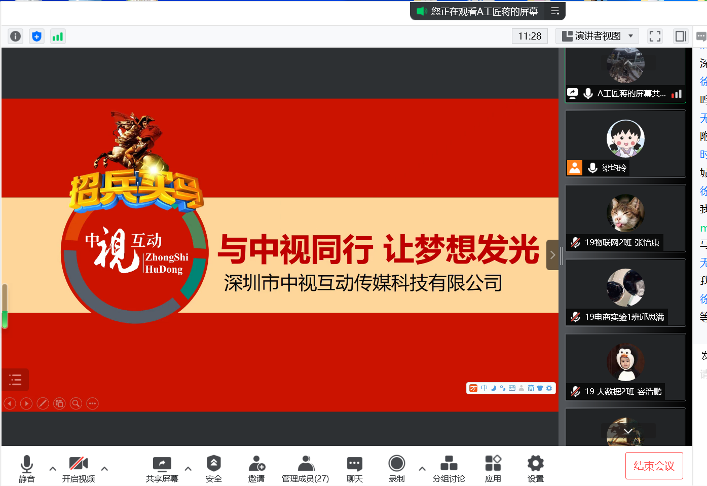 为更好推进毕业生的就业工作,强化“高校书记董事长访企拓岗促就业”专项行动的工作成效,切实做好毕业生就业服务工作,5月10日,公司邀请广州正道科技有限公司和深圳市中视互动传媒科技有限公司开展专场宣讲会。