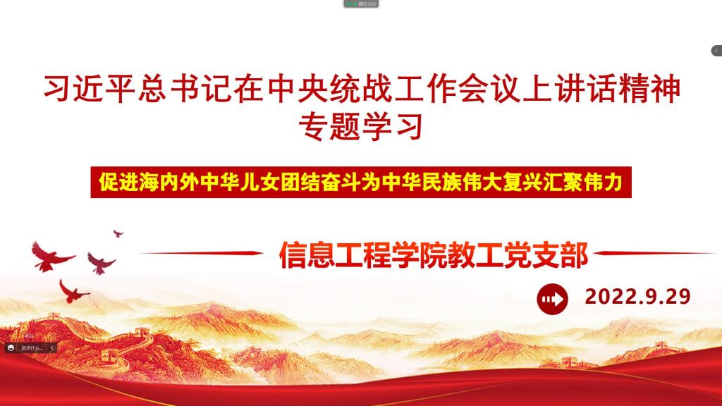 9月29日,公司教工党支部组织开展9月份专题学习活动,本次学习内容为《习近平总书记在中央统战工作会议上的讲话精神》。会议由支部书记刘君主持,全体党员通过腾讯会议参加学习。