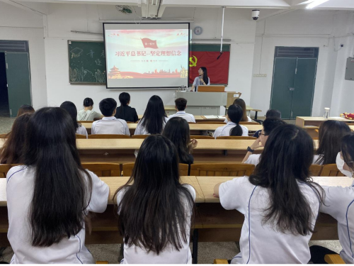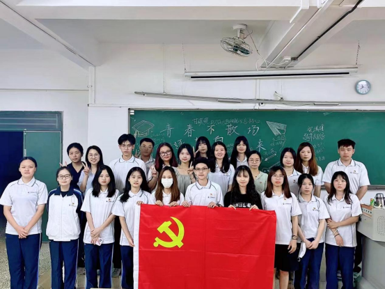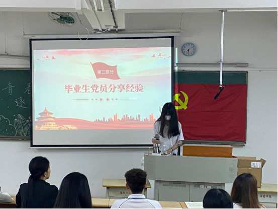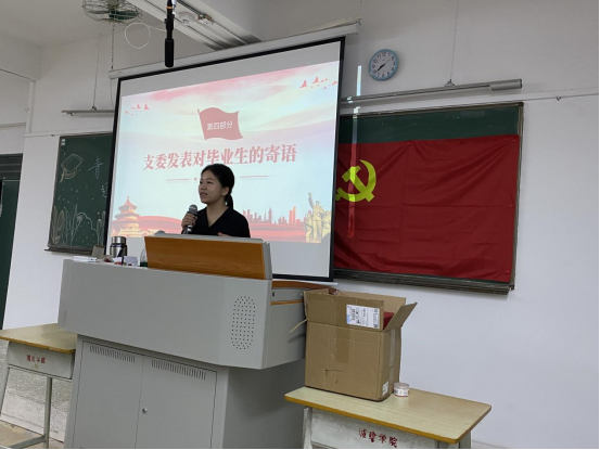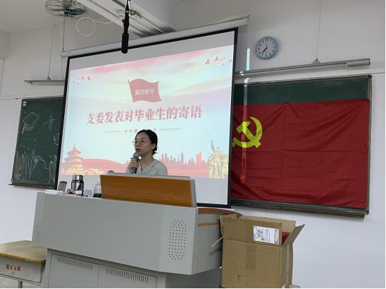 支部宣传委员林赛赛发表对毕业生的寄语:三年时间,转眼即逝,绿荫满园的校圆满载着说不尽的美好青春时光和成长奋斗故事,也看到大家的成长与收获,衷心祝福大家毕业快乐,希望大家牢记党员身份,不忘初心、牢记使命,永远记得胸前党徽的这抹红,时刻按照党员标准严格要求自己,用实际行动践行在党旗下的神圣誓言。