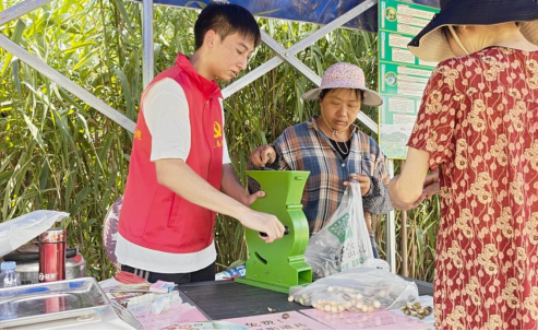 采摘结束后,队员们将新鲜的莲蓬运送到加工区,开始进行敲打取籽与机械剥壳操作。在农户的指导下,大家分工协作:一部分队员手持木槌,小心敲击莲蓬,一颗颗莲子随之掉落;另一部分则协助使用机械设备完成去壳处理。尽管天气炎热,汗水早已浸透衣背,但没有人退缩,大家都在认真完成每一项任务。“没想到一颗小小的莲子,背后竟藏着这么多辛劳与付出。”一名队员边擦汗边感慨地说,“今天才真正体会到‘粒粒皆辛苦’的含义。”