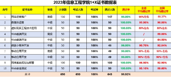 经过严格的申报和审批流程,公司2023年“1+X”试点证书申报计划数为650,获批数为650,应参加考试人数为650,实际考试人数为650,指标完成率高达100%,共有643人顺利通过考试,取得相应证书,证书平均通过率高达98.92%,均高于全省甚至全国的平均水平。
