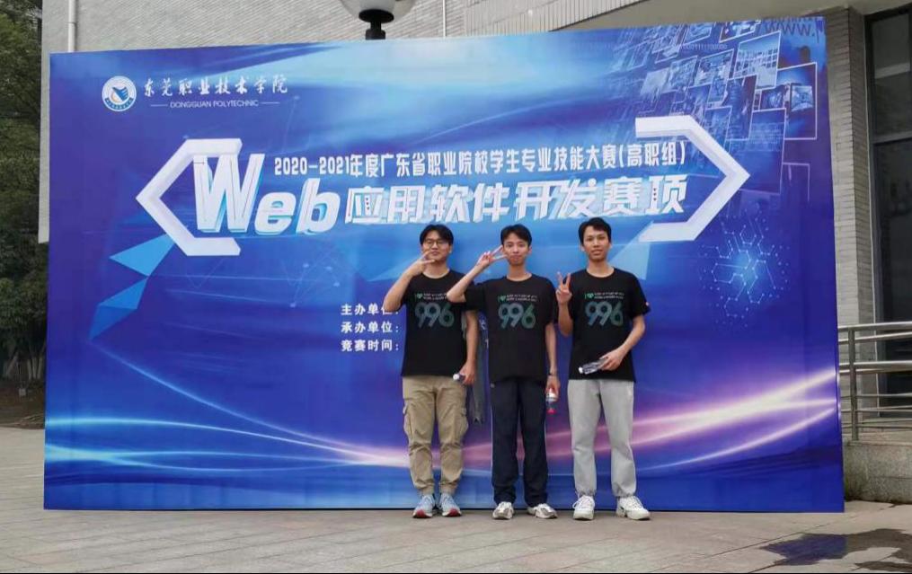 4月17日,2020-2021年度广东省职业院校员工专业技能大赛(高职组)“Web应用软件开发”赛项在东莞职业技术公司举行,由张宇、谢国华老师指导的19级软件技术专业周泳宾、程梦程、叶泳杰三位同学组成的参赛队伍,经过激烈的角逐,获得了省赛一等奖。
