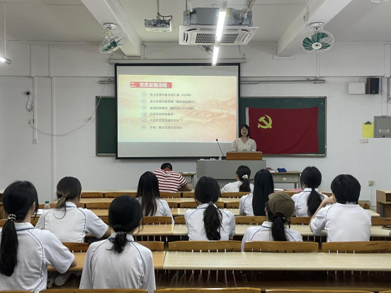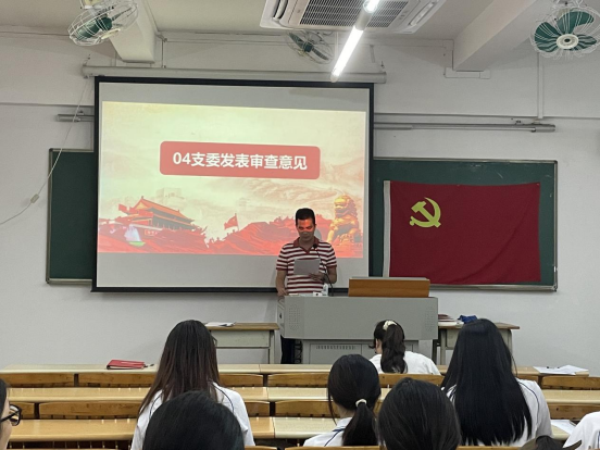 支部委员叶勤宣读支委审查意见和家庭成员政治情况,客观公正地提出优点与不足、批评与建议,并表明态度。