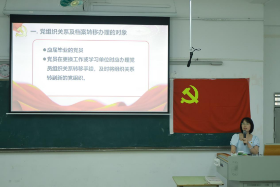 党建办公室指导老师苏碧玲就党员组织关系转接工作进行专题培训,通过流程图解、案例分析等方式,系统讲解转接规范与注意事项,为毕业生党员踏上新征程提供精准指导。