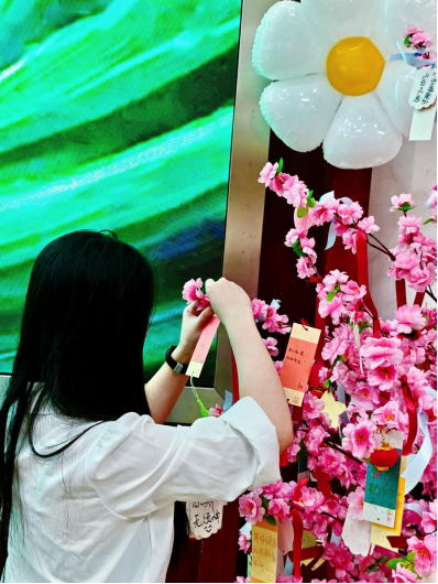 全体心站成员与歌手邓维涛、郭代宇共同合唱站歌《最美的期待》,现场师生自发点亮手机闪光灯,整个礼堂顿时化作璀璨星河。活动现场还特别设置了“星光心愿树”互动环节。200余张满载祝福的卡片在微风中轻轻摇曳,传递着师生间的真挚情谊。