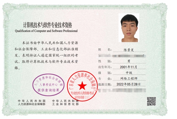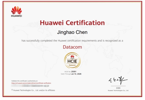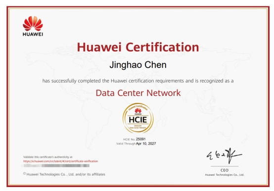 除课堂学习和竞赛外,他还善于利用实践来巩固所学知识,通过个人项目和实战经验,将理论知识转化为实践应用能力。在校期间,他凭借出色的学习能力、扎实的专业知识、过硬的专业技能和良好的心理素质考取了华为全球顶级认证“华为HCIE-DATACOM ”、“华为HCIE-Data Center Networ证书”、人社部和工信部颁发的计算机技术与软件专业技术资格证书“网络工程师”。