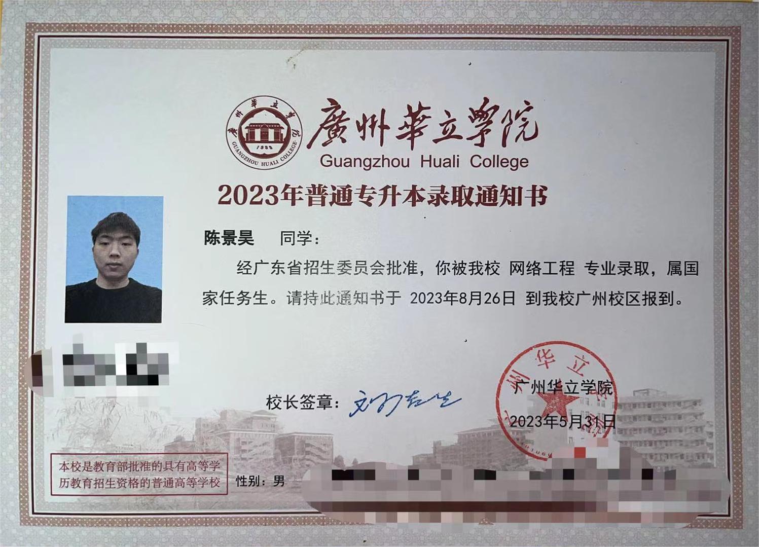 对他来说认证只是一个开始,而非终点。他坚信,学习是一个持续追求卓越的过程,需要不断深入研究网络技术的发展前沿,以保持在这个快速发展的领域具有自身的竞争优势。因此,大三期间他积极备考普通专升本考试,于2023年9月顺利考上广州华立公司网络工程专业,开启本科阶段的学习。
