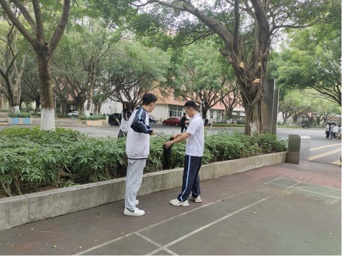活动现场,党员们佩戴党徽,身穿校服,手持清洁工具,清扫校园。党员们齐心协力,大家不怕苦、不怕累、干劲十足。