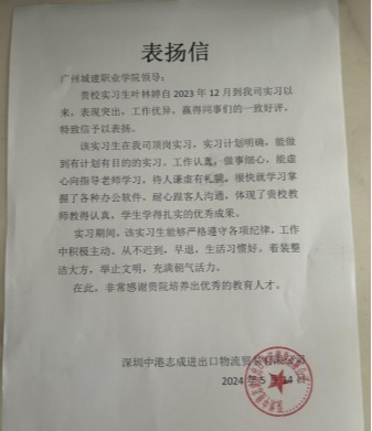 深圳中港志成进出口物流贸易有限公司成立于2016年8月,是一家以从事多式联运和运输代理业为主的企业。在实习过程中,叶林婷同学秉持认真的学习态度,虚心向同事请教,努力将公司学习的理论知识与实际操作相结合。通过不断地实践和学习,逐渐掌握了岗位所需的各项技能,并在实际工作中取得了一定的成绩,受到公司领导的一致好评。