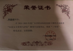 自入学起,便以“知识筑基,实践赋能”为目标,在学业与实践中寻找平衡点。课堂上,他始终保持着前排就坐的习惯,笔记本上密密麻麻的课堂笔记与延伸思考,成为同学们争相传阅的“学习宝典”;课后,他主动拓展专业视野,通过Coursera平台学习云计算认证课程,参与CSDN技术论坛的代码开源项目,逐渐构建起跨学科的知识网络。这份执着让他在两年内连续斩获校级一等奖学金、二等奖学金,更在省级竞技舞台崭露头角——广东省计算机设计大赛中,他带领团队开发的“智慧校园能耗监测系统”,凭借物联网技术与数据分析的创新融合斩获三等奖;在高手云集的广东省职业技能大赛中,他通过模拟企业级网络攻防场景,勇夺二等奖。而鲜红志愿者证书上记录的100余小时服务时长,则见证了他另一面的成长轨迹:从图书馆书籍整理员到社区“银发数字课堂”讲师,他用专业知识帮助老人跨越“数字鸿沟”,在奉献中深化了对技术向善的理解。参与各类竞赛:主动参与公司开展的各种专业竞赛,在竞赛中不断提高自身专业知识的运用能力。获得2024年度广东省计算机设计大赛三等奖,2024年度广东省羊城杯优胜奖,2024-2025年度广东省职业技能大赛二等奖等。