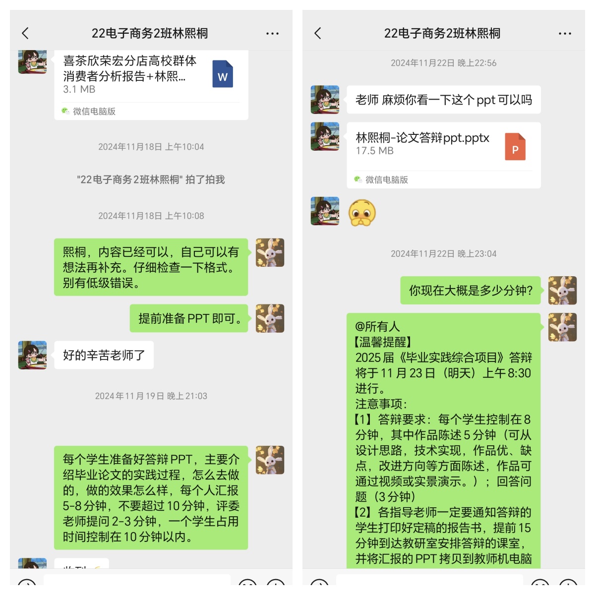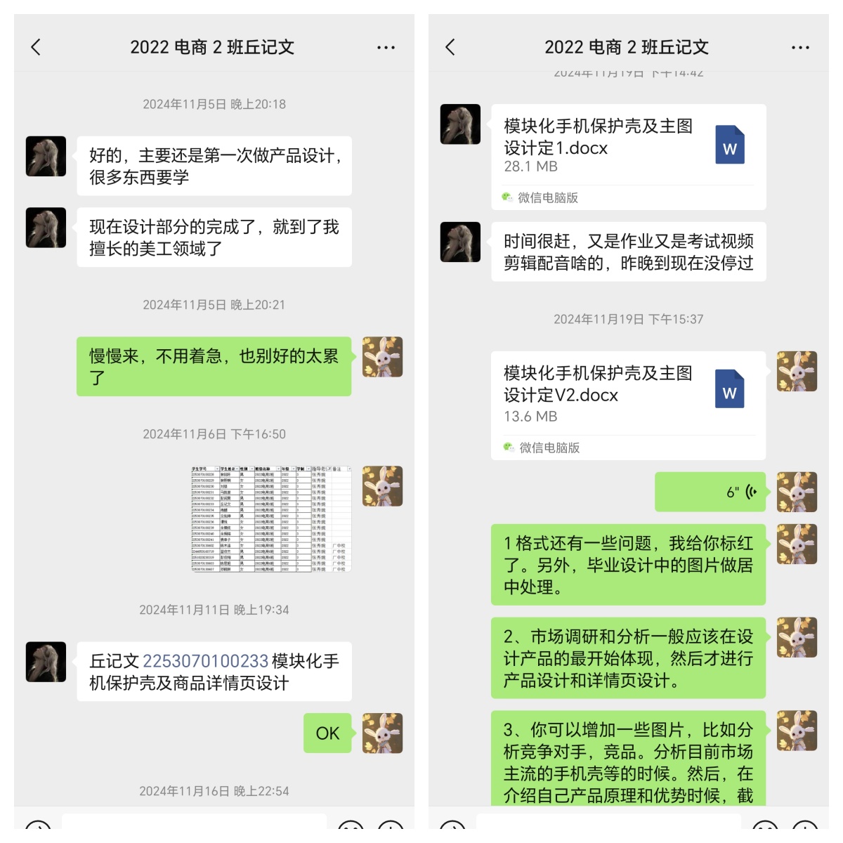 张秀婉老师指导的22级电子商务2班丘记文同学的作品《模块化手机保护壳及商品详情页设计》和林熙桐同学的作品《喜茶欣荣分店高校员工群体消费者分析报告》被评为优秀综合实践项目。两位同学在各环节中表现整体优异、态度认真负责,能快速领悟修改意见,及时对实践报告进一步打磨优化。在设计与撰写中体现出扎实的专业素质,以及对电商理念的深刻理解与体会。