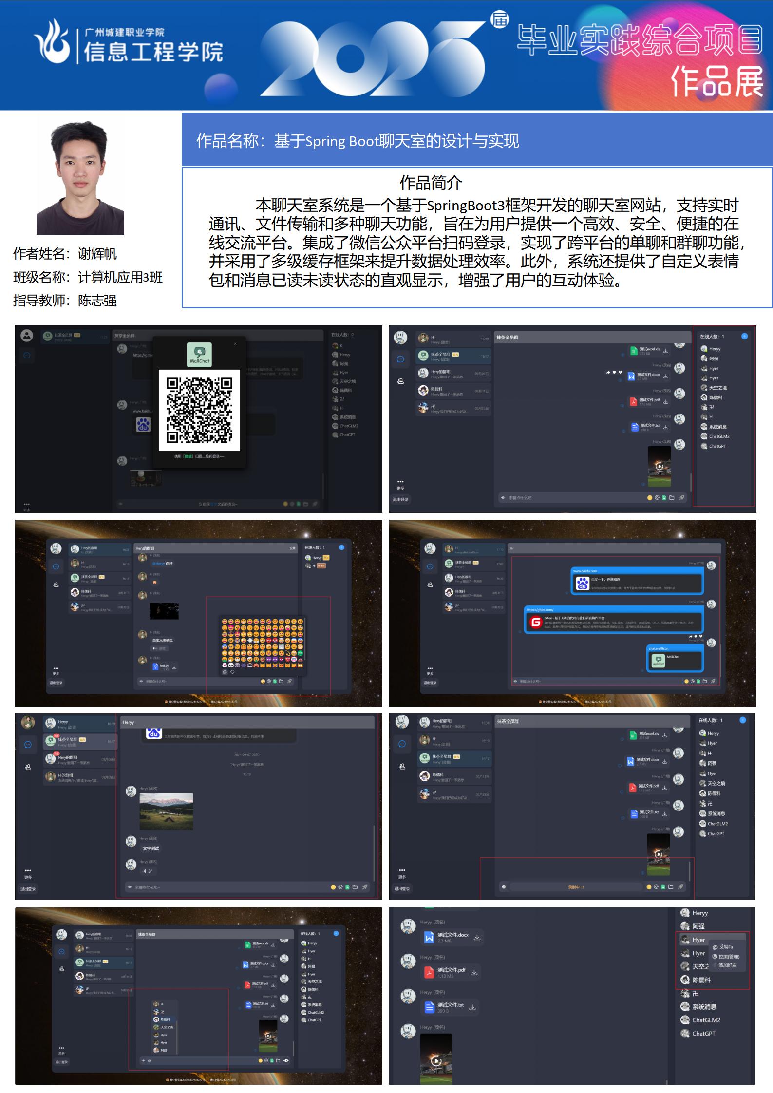 陈志强老师指导的22级计算机应用3班谢辉帆同学的作品“基于Spring Boot聊天室的设计与实现”被评为优秀综合实践项目。该同学在各环节中表现整体优异、态度认真负责,能快速领悟修改意见,及时对实践报告进一步打磨优化。在设计与撰写中体现出扎实的专业素质,以及对聊天室系统的深刻理解与体会。