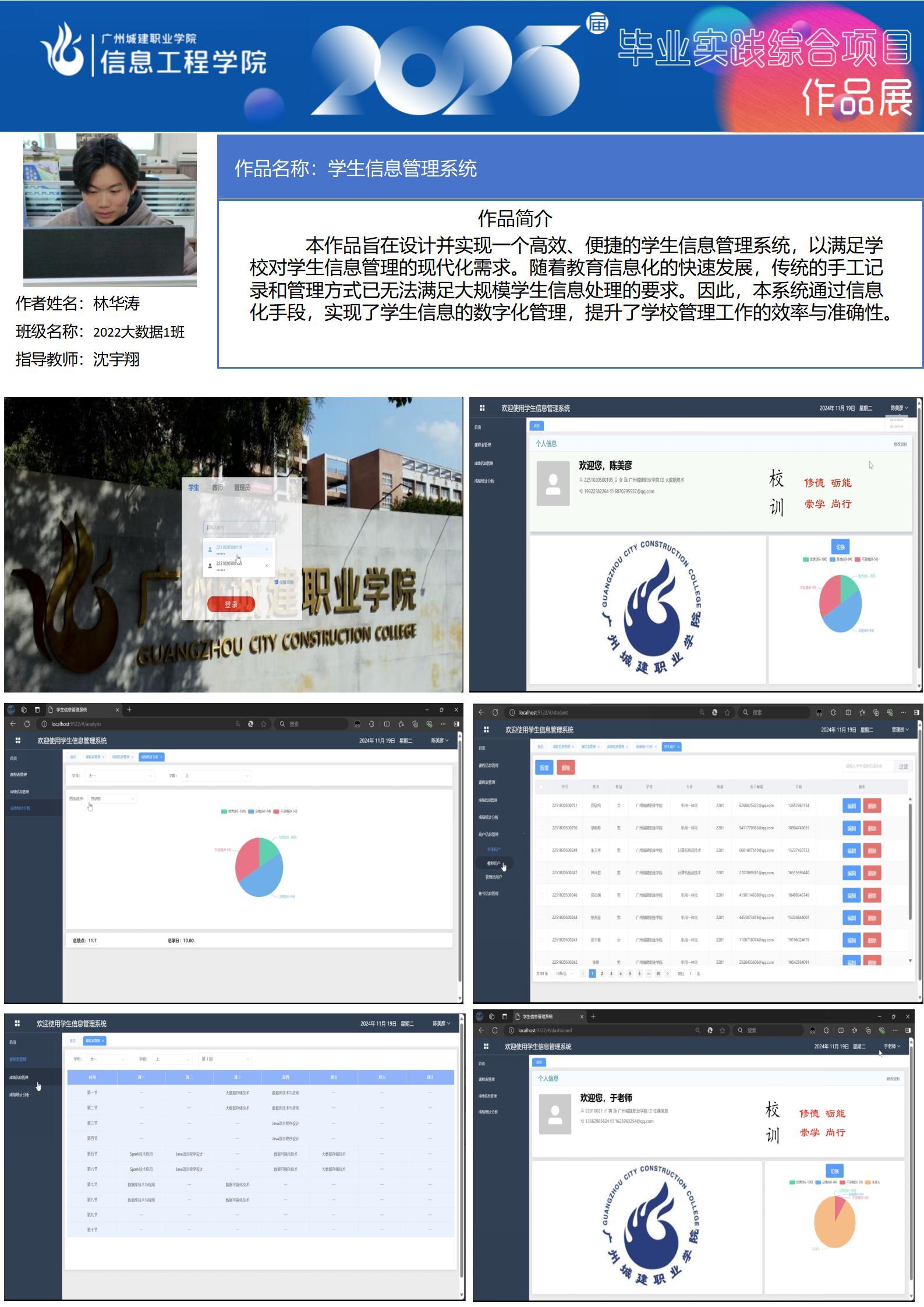 最后,21名同学都顺利通过答辩,其中2人获得优秀评价,15人获得良好评价。其中2022大数据1班林华涛同学的作品《员工信息管理系统》获得“2025届毕业实践综合项目优秀成果”称号。2022大数据1班黄锦荣同学的作品《飞机大战游戏》和林华涛同学的作品《员工信息管理系统》被太阳成集团tyc收录至2025届《优秀综合实践项目》作品展。
